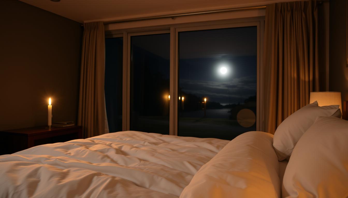 Your sleep environment is key to good sleep. Set your bedroom temperature between 65–68°F (18–20°C). This matches your body’s natural cooling, which makes you sleepy. Use breathable bedding like cotton or moisture-wicking materials.